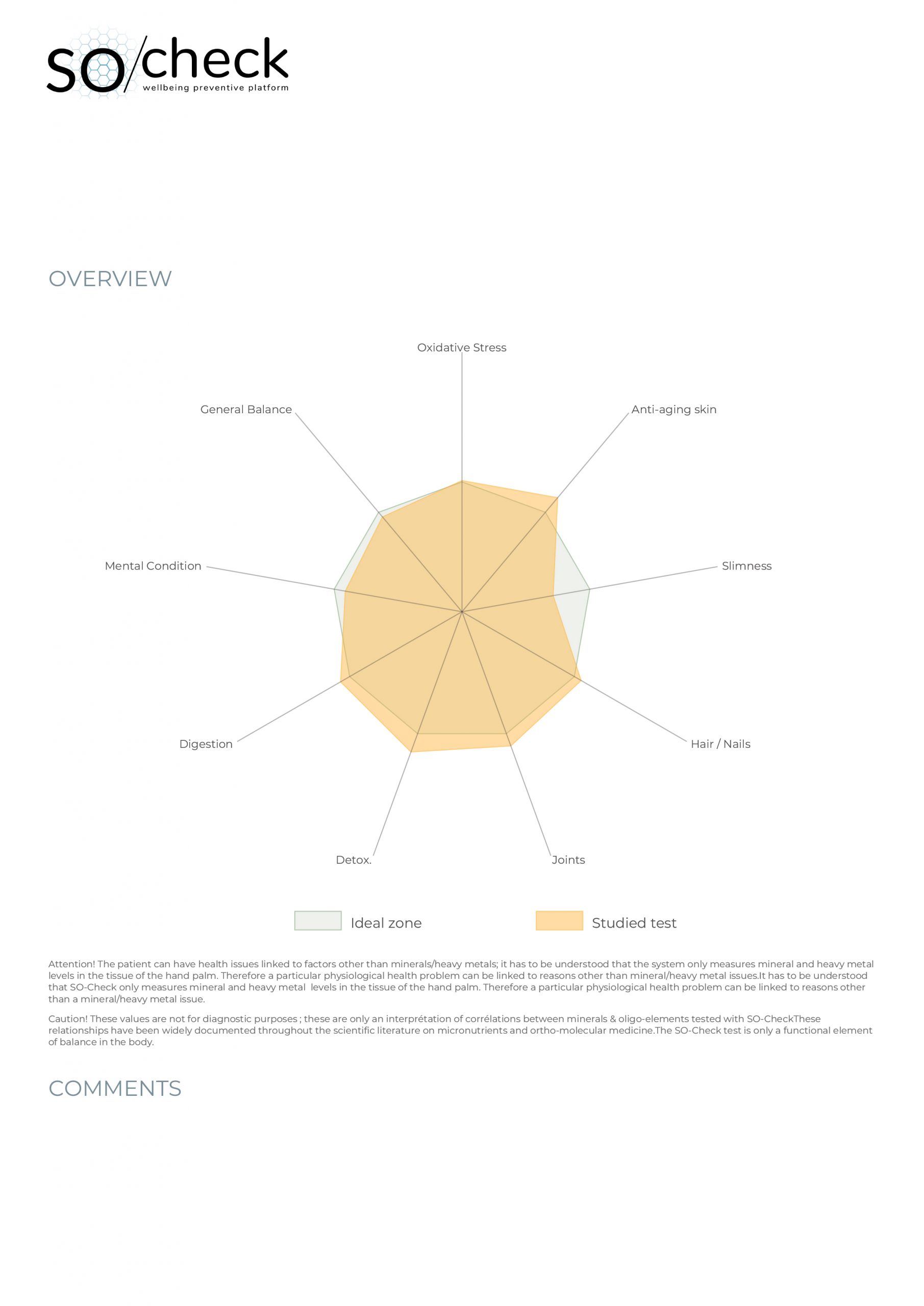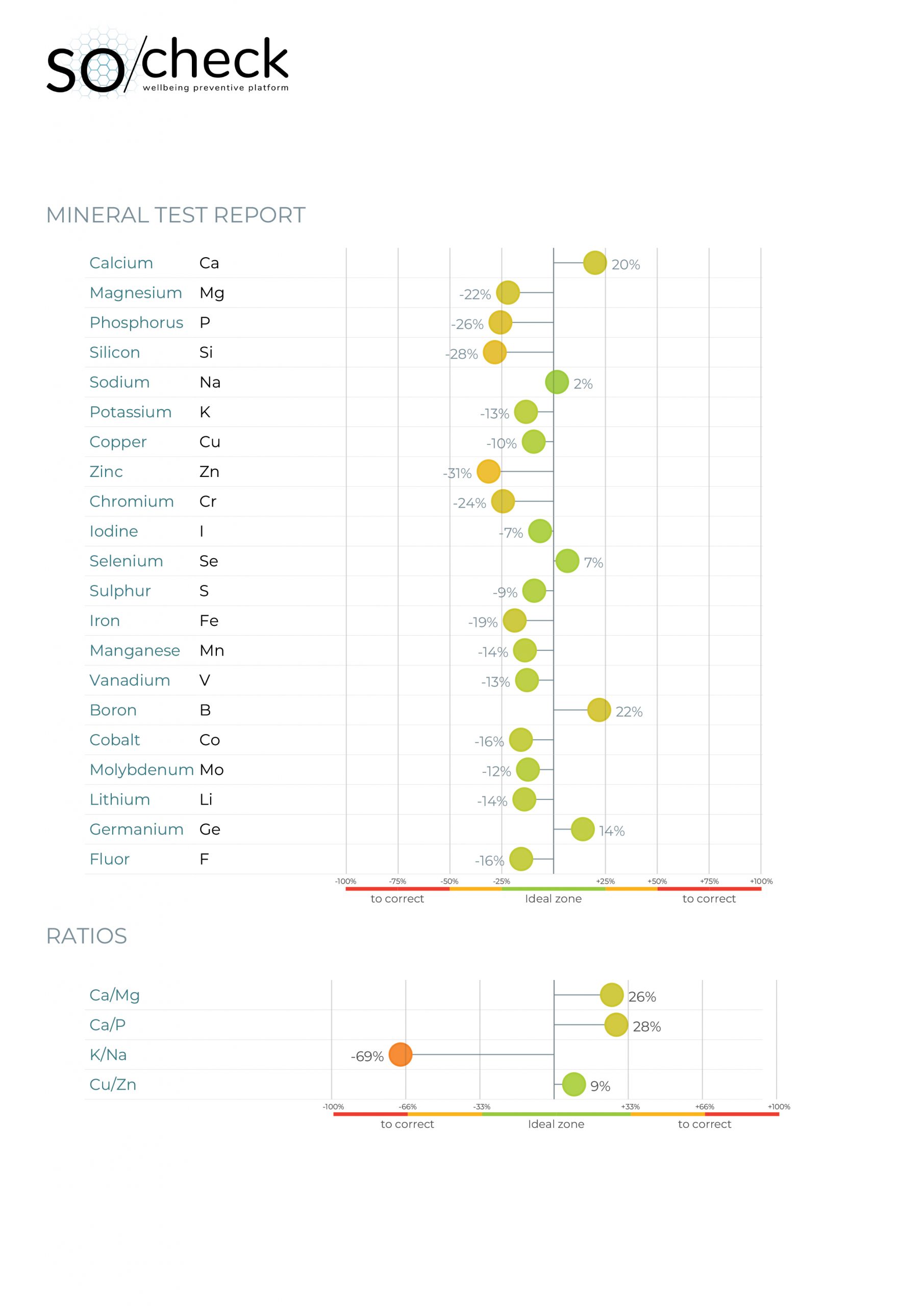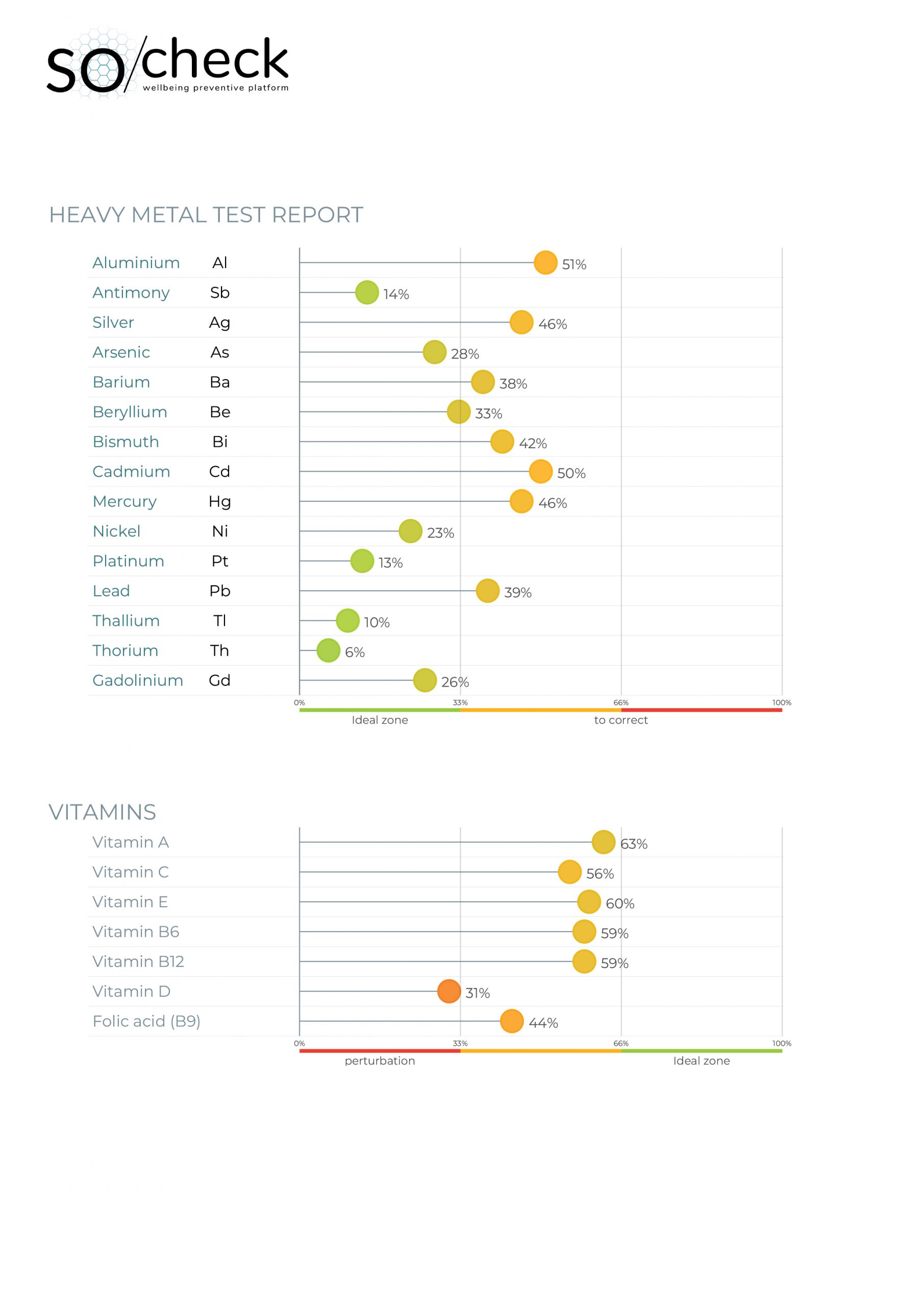 Pri meritvah uporabimo prenosni spektrofotometer, ki je povezan z računalnikom. Poročilo na 5 straneh, ki vključuje 20 mineralov, 15 težkih kovin, 7 vitaminov in 24 različnih parametrov za oceno zdravja dobimo takoj.